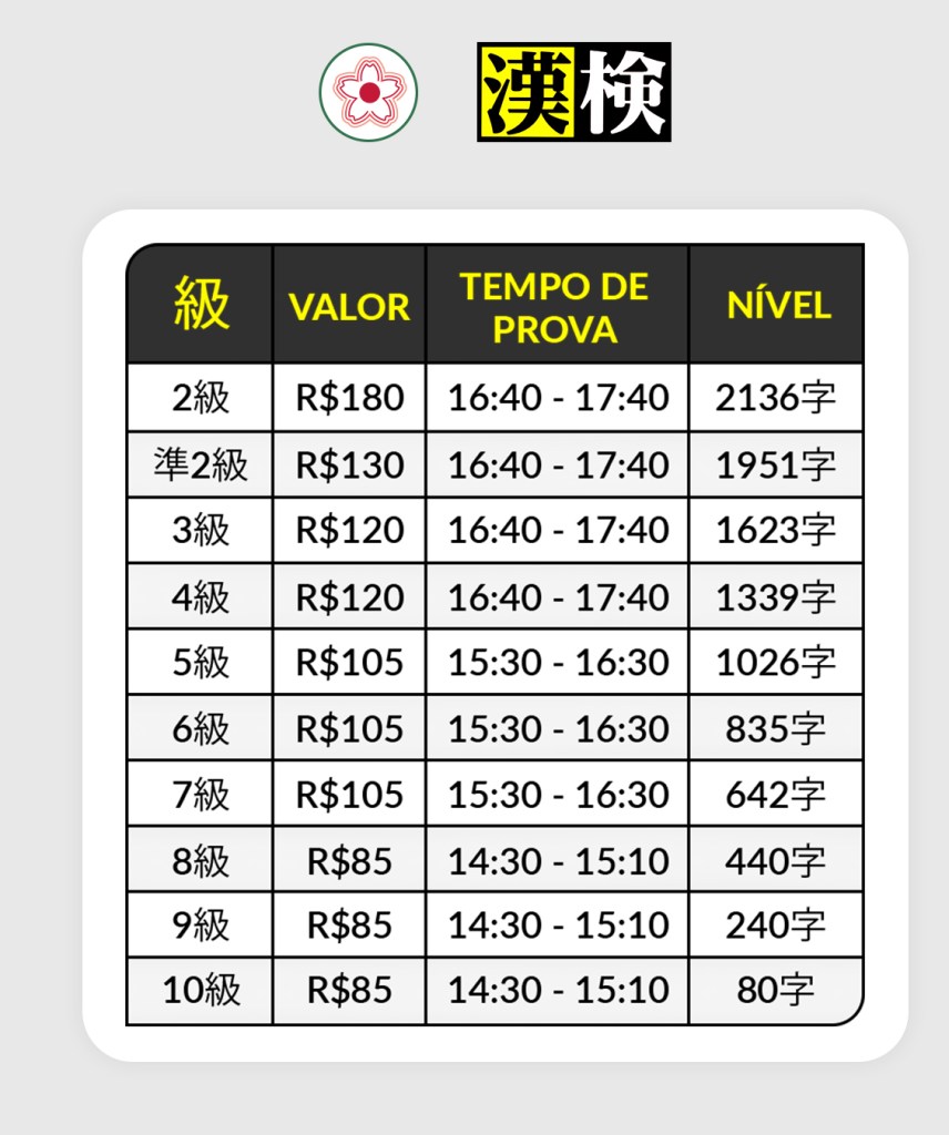 O Kanken é a prova de proficiência em KANJI e é dividida em 10 níveis, sendo o mais fácil o nível 10 e o mais difícil, o nível 1.